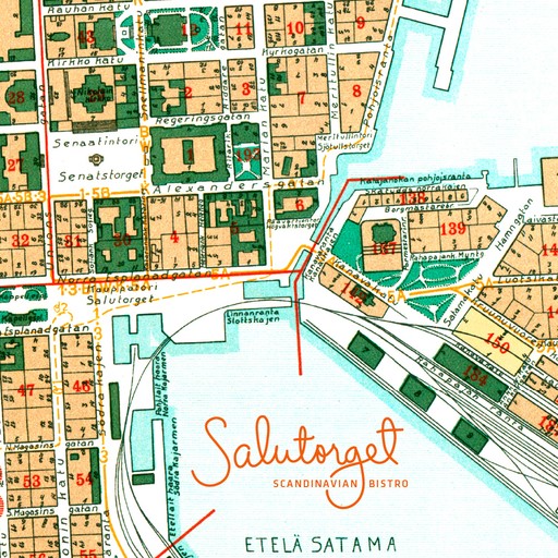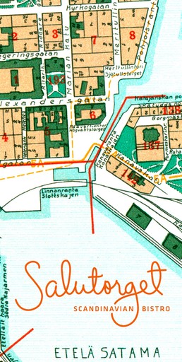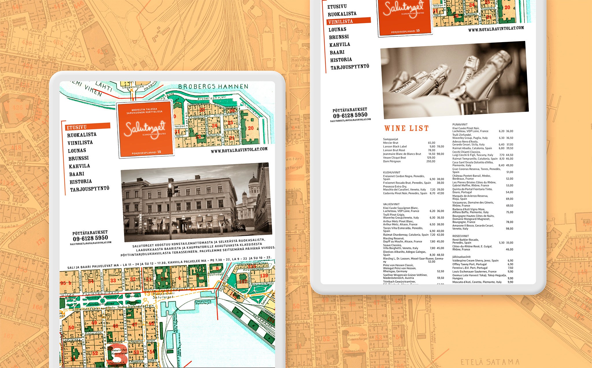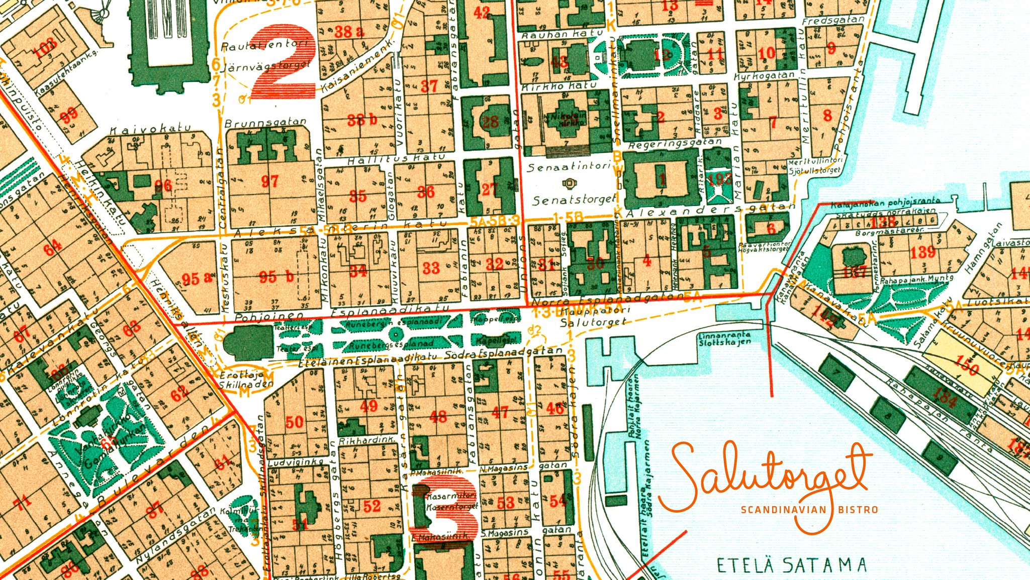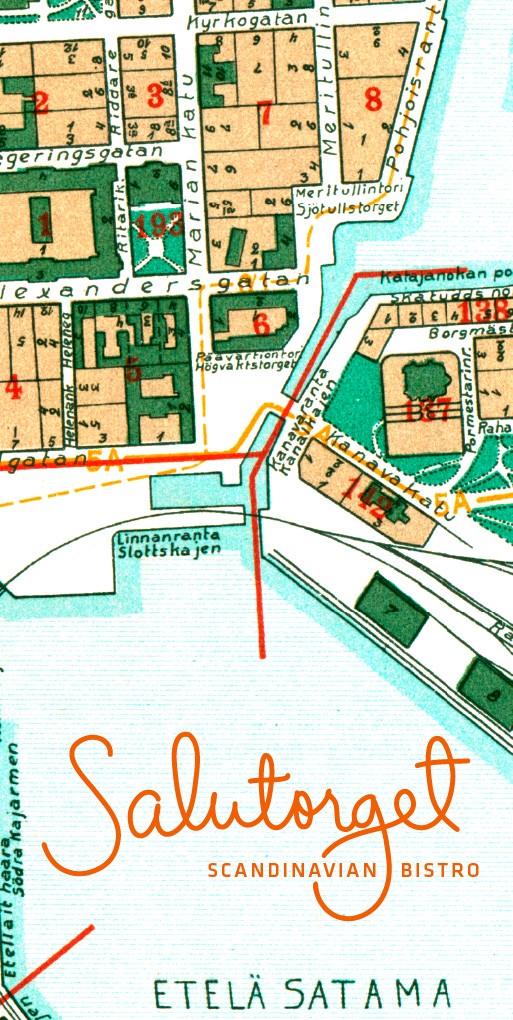 Brofeltin taloon, Sarvikuokon kortteliin perustetun Salutorgetin ilme ei voinut olla mitä vain. Sen suunnittelu lähti liikkeelle vanhojen karttojen värimaailmasta ja typografiasta sekä Kauppatorin tunnelmasta. Kartta onkin vahva osa Salutorgetin alkuperäistä identiteettiä, jota koristaa vahva oranssi värli ja käsinpiirretty logo.