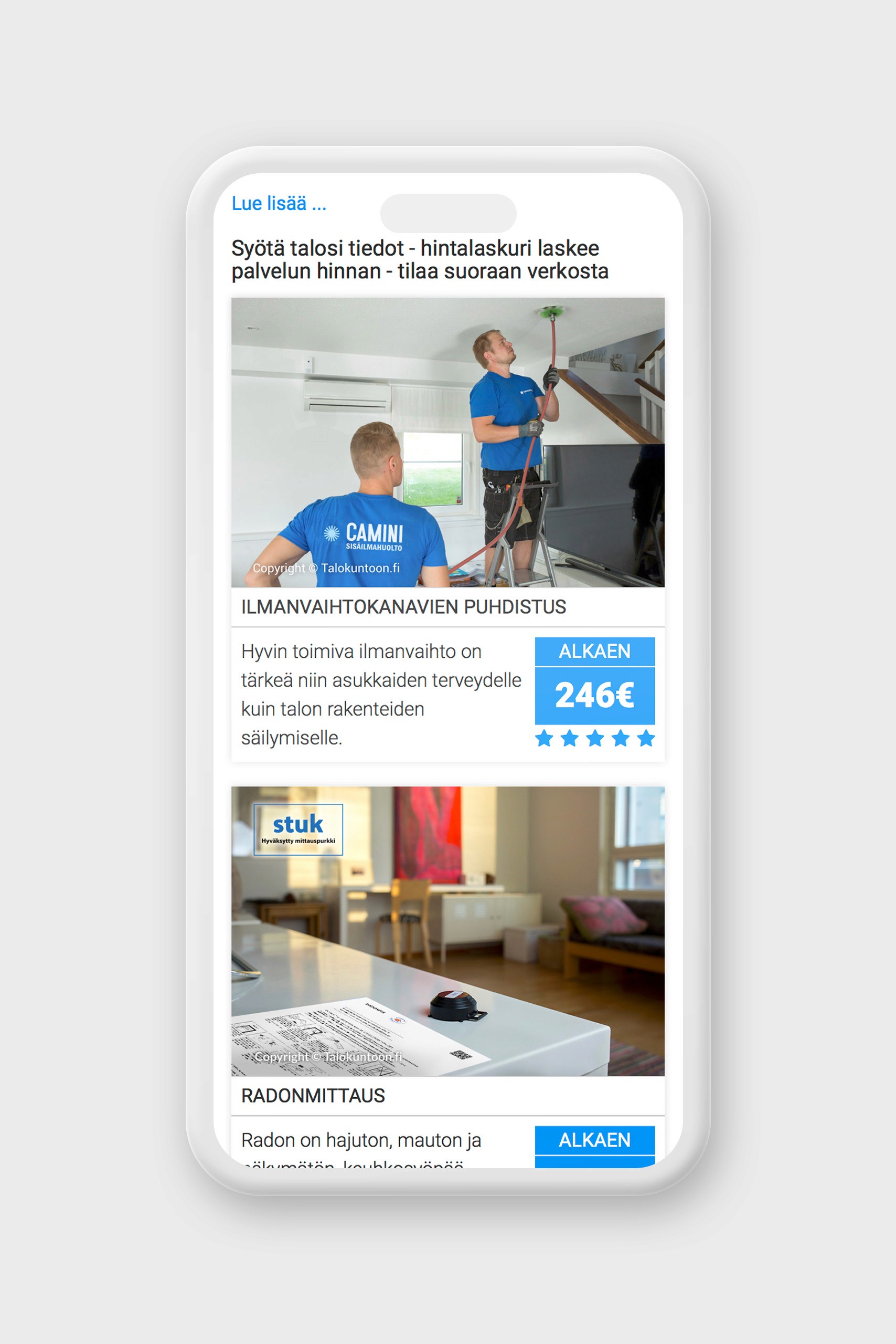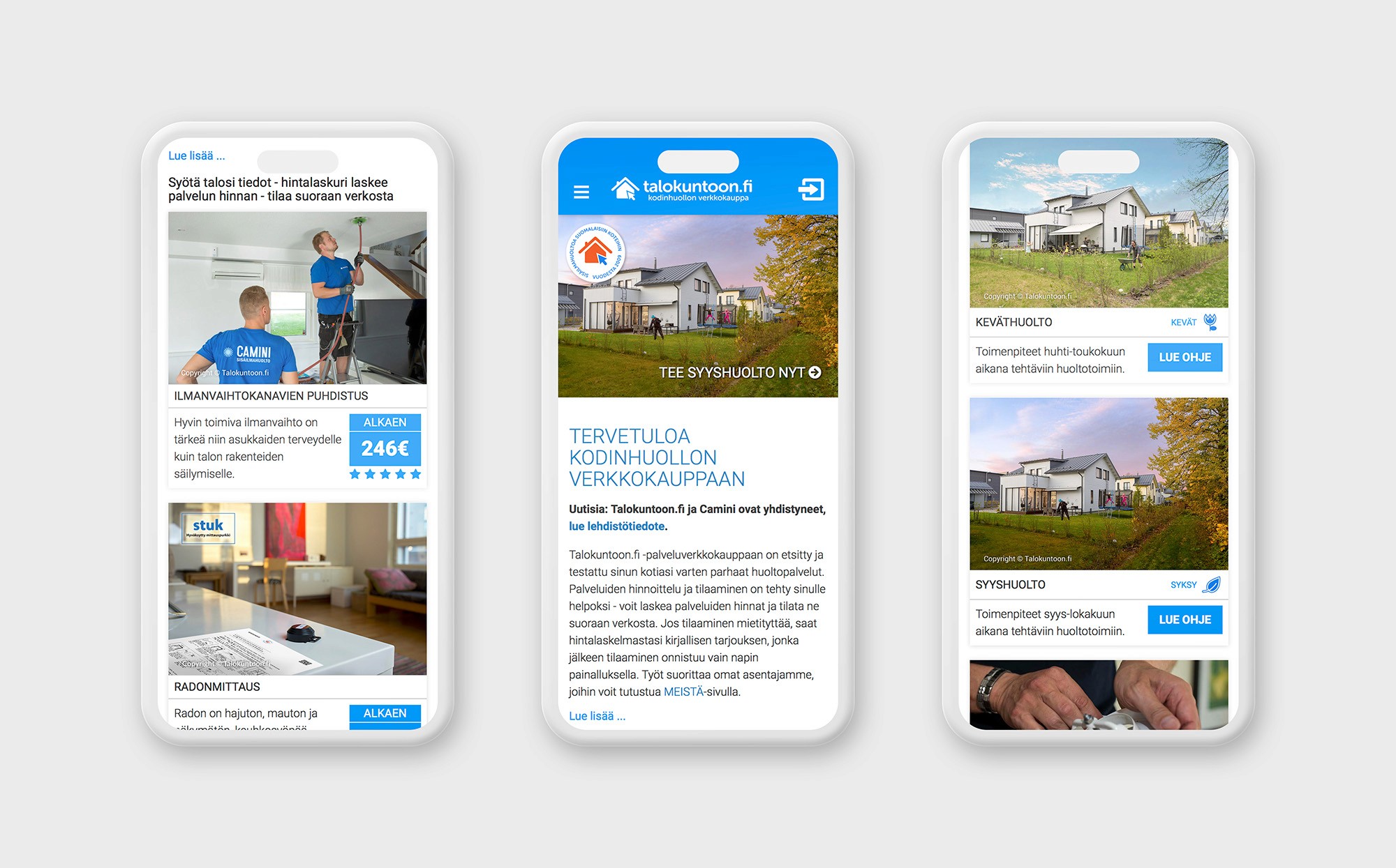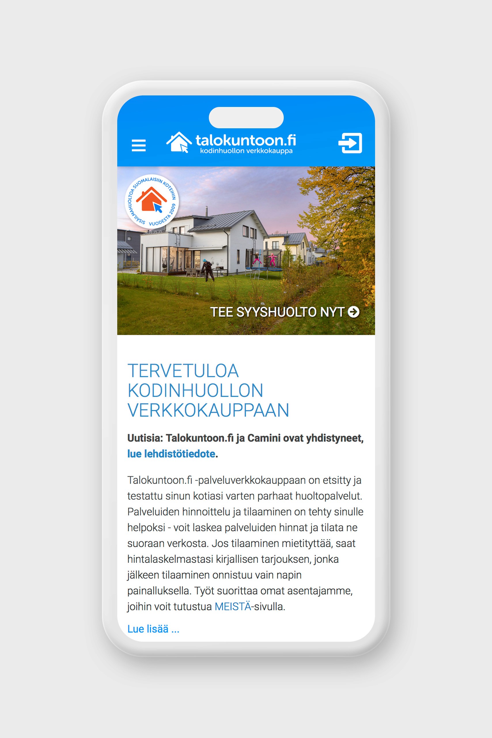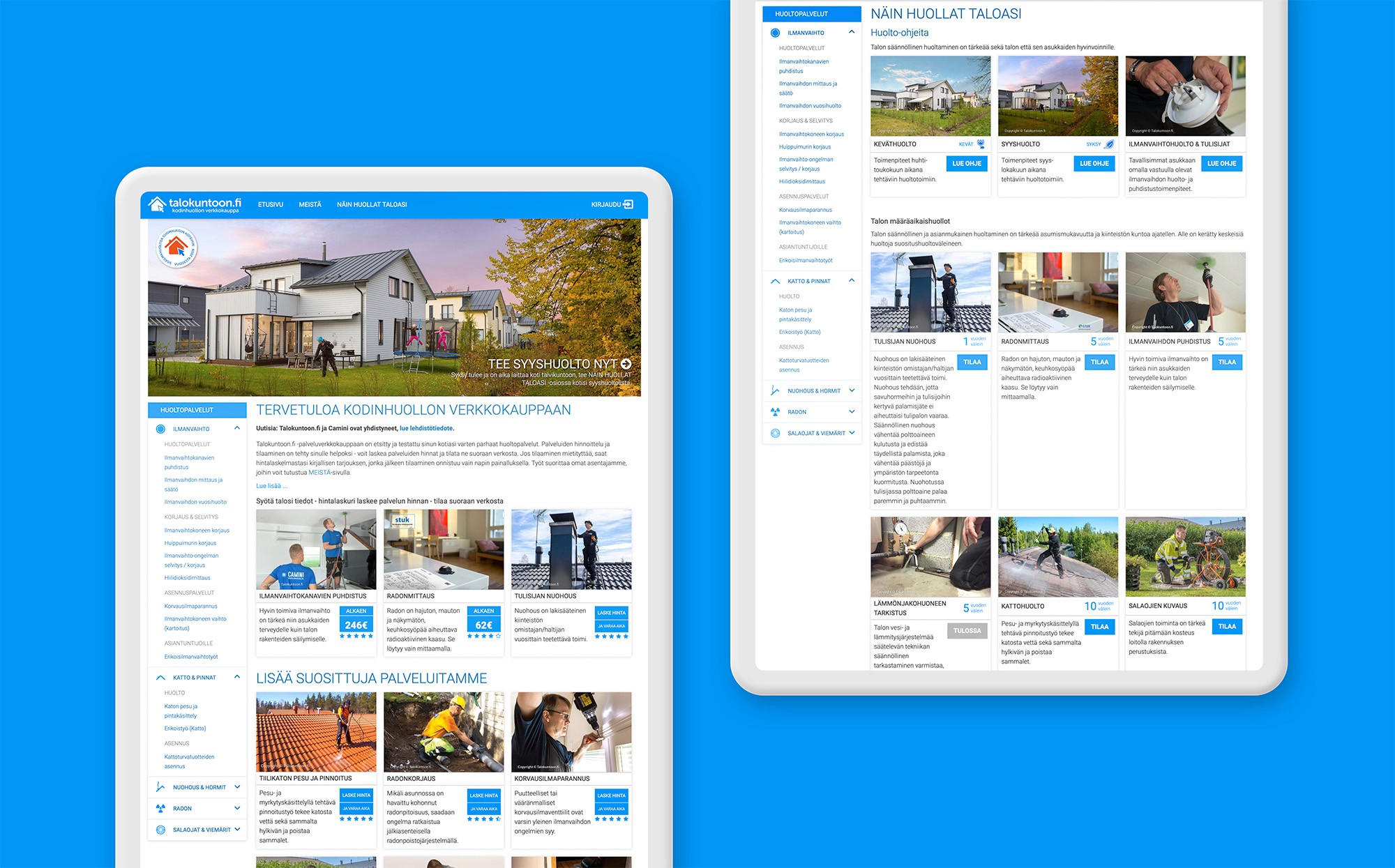 ”Miksi melkein kaiken muun voi ostaa verkosta, mutta ei kodin huoltoa?” Tähän tarpeeseen vastaa talokuntoon.fi -verkkokauppa. Brändisuunnittelussa otettiin tarkasti huomioon kohderyhmä ja hintataso sekä varmistettiin luotettavan toimijan mielikuva. Näin palvelujen tilaamisen kynnys on mahdollisimman matala.
